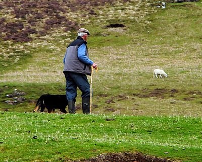 On down the road we stop for a beautiful view out the loch. Dick turns and looks up hill as Carolyn is taking a picture of the loch and sees a man herding his sheep the old fashion way. Mostly we have seen men on four-wheelers doing this task. We watch while he and two dogs herd the sheep into a pen. Dick walks over and tells the man how much we enjoyed watching his dogs work which seems to please him a great deal.